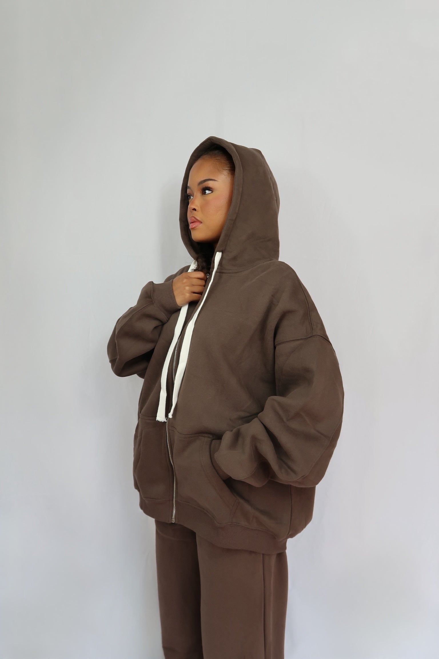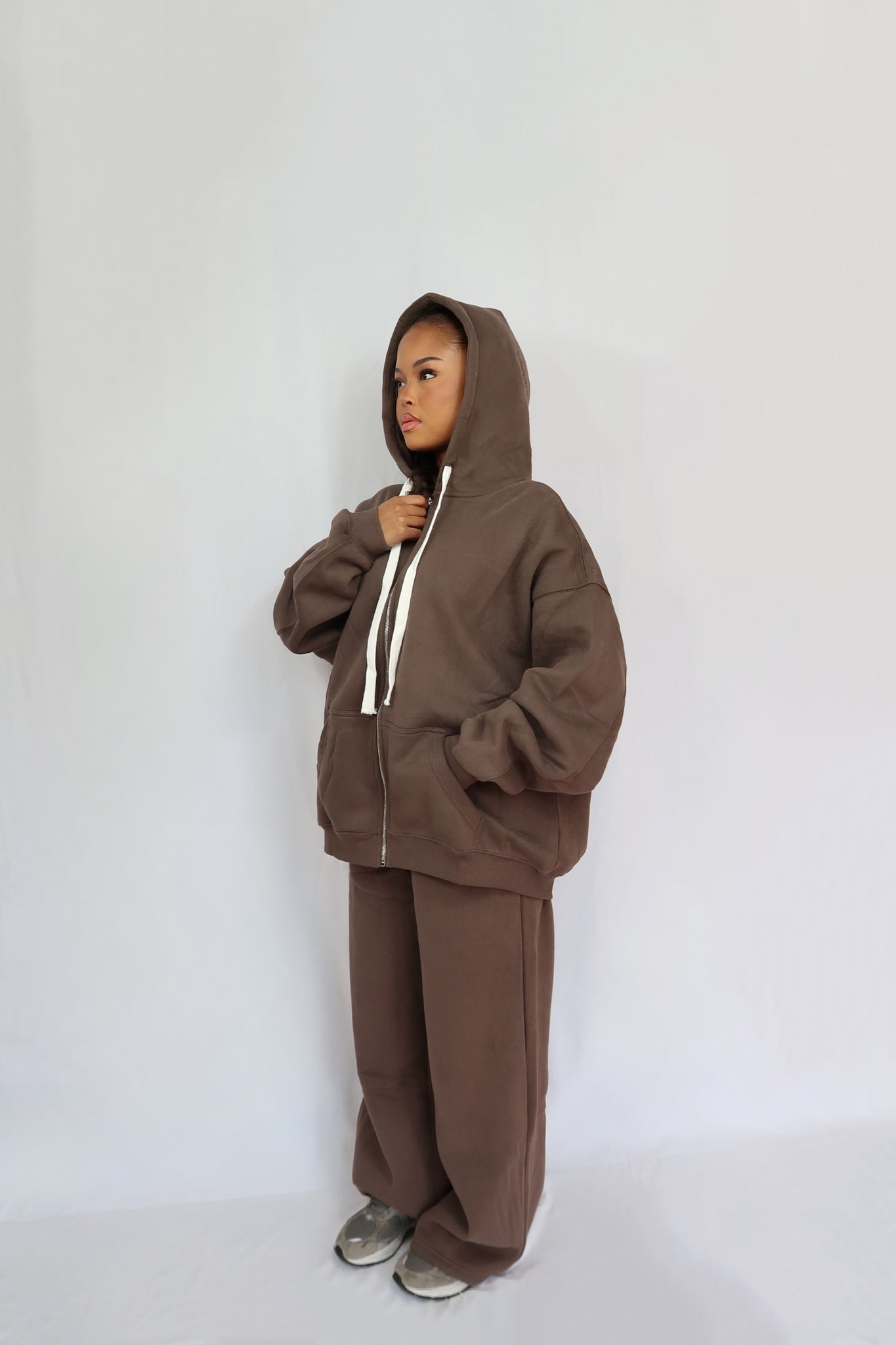 Ensemble de jogging très épais comprenant un pantalon droit à taille élastique avec poche et une veste à capuche oversize.