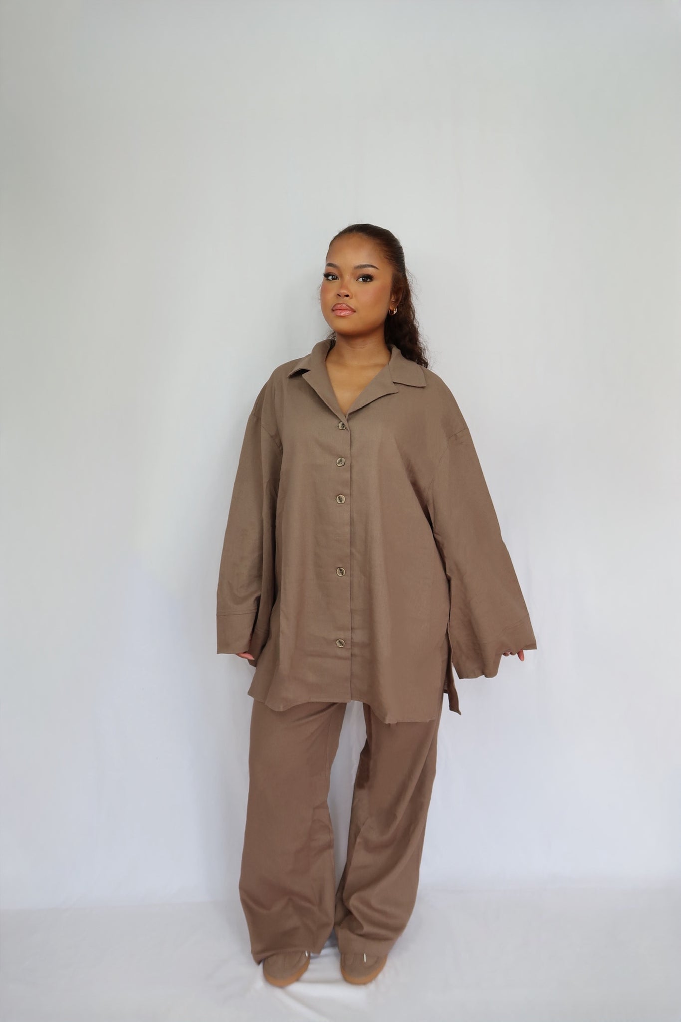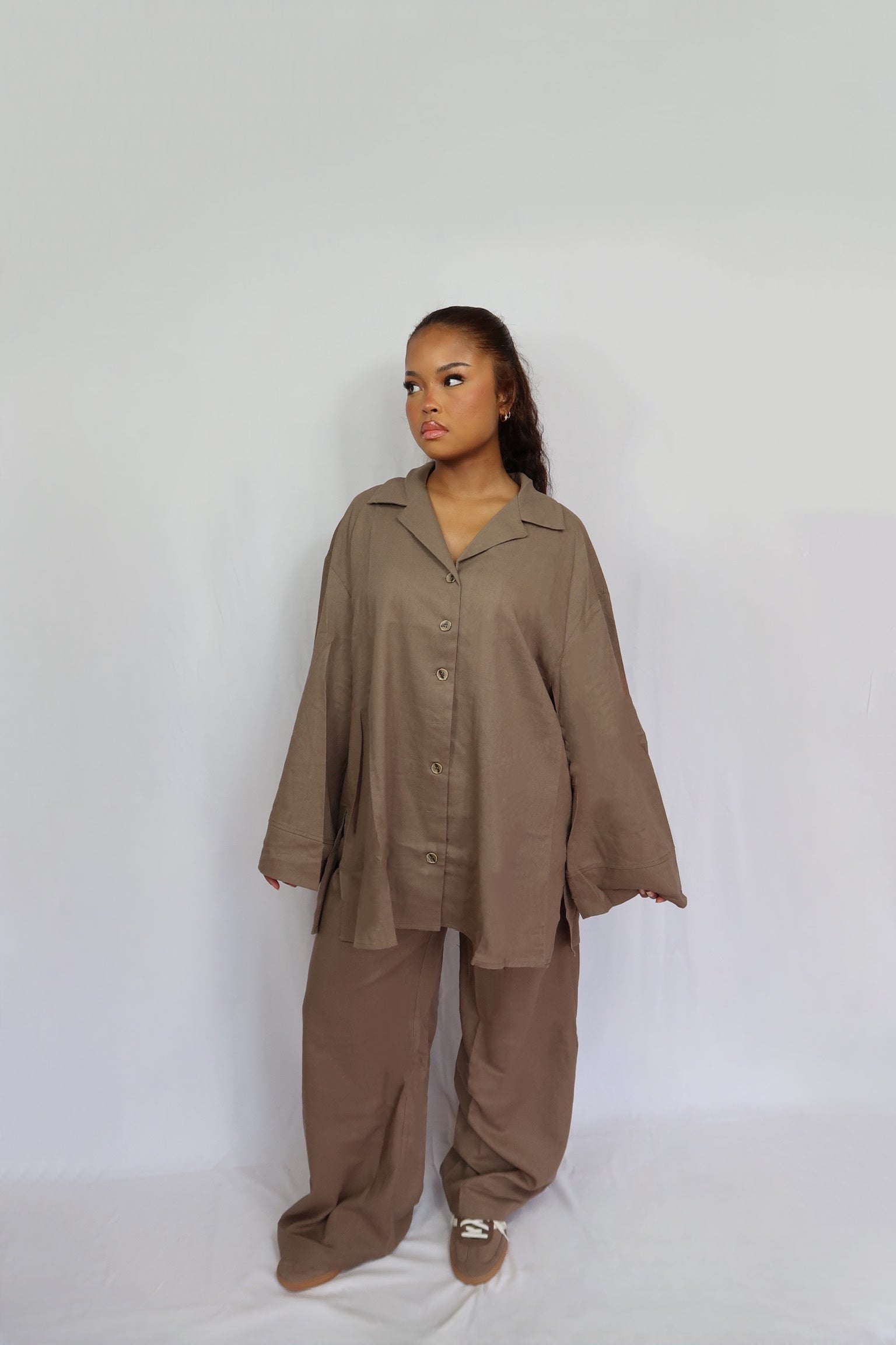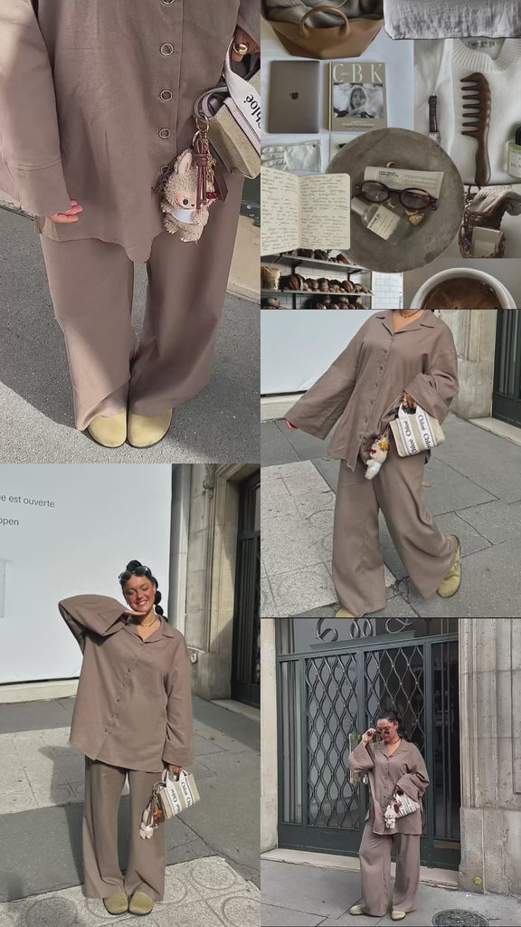 Ensemble en lin oversize avec détails boutons texturés. Composé d’une chemise longue et d’un pantalon large à taille élastique.