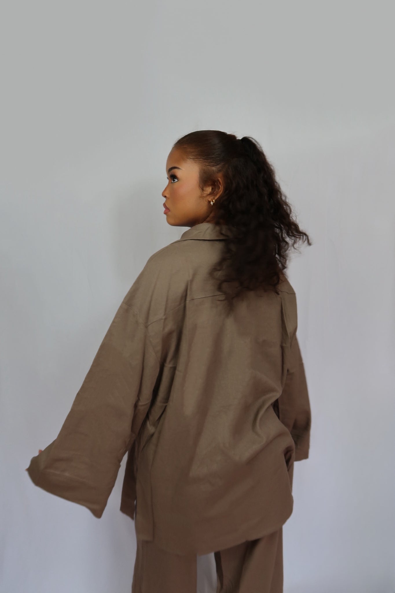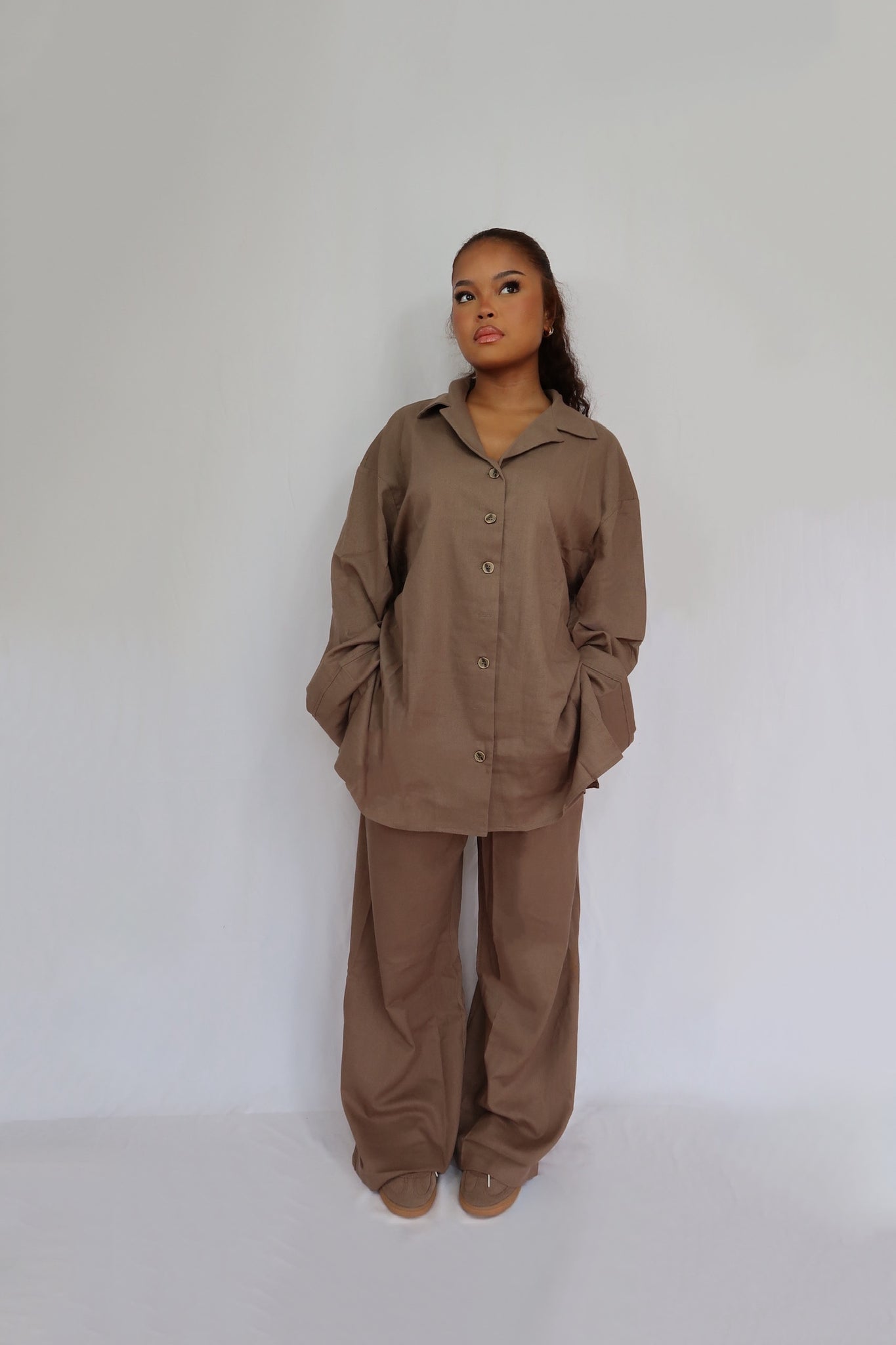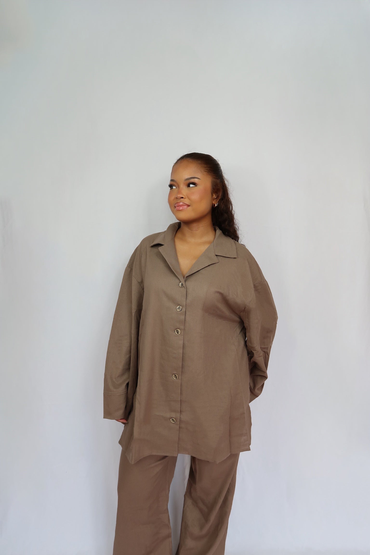 Ensemble en lin oversize avec détails boutons texturés. Composé d’une chemise longue et d’un pantalon large à taille élastique.