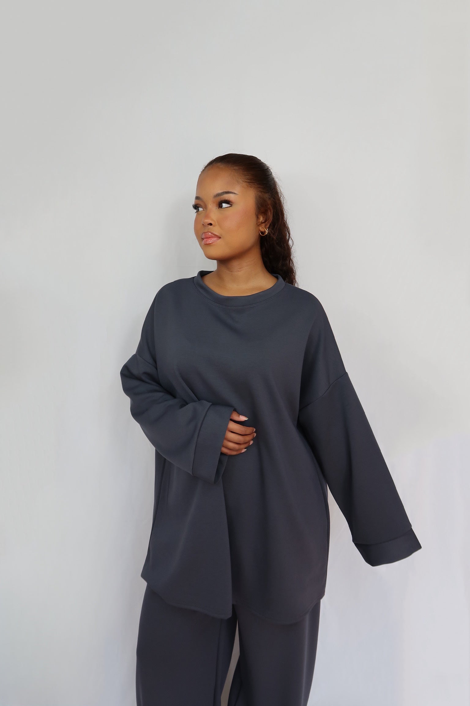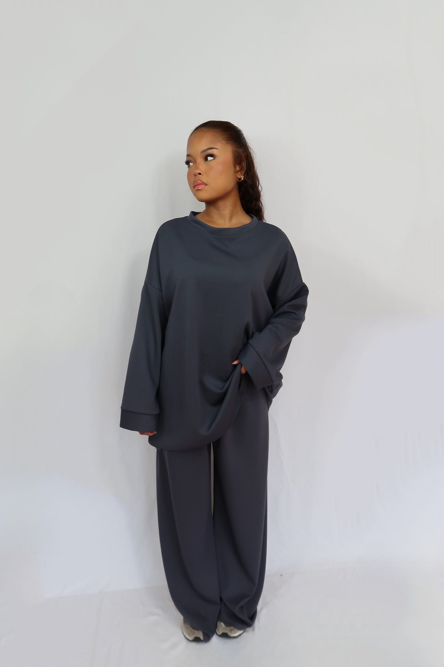 Ensemble oversize composé d’un top long et d’un pantalon fluide.