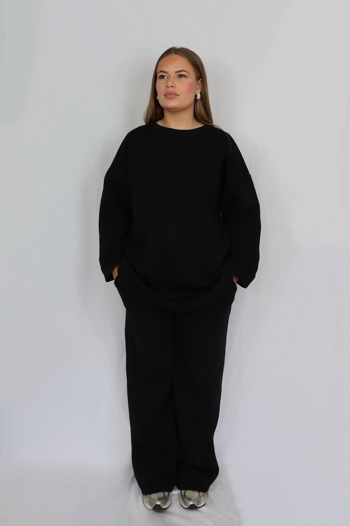 Ensemble de Jogging noir composé d’un sweat oversize et d’un pantalon de jogging droit à poches.