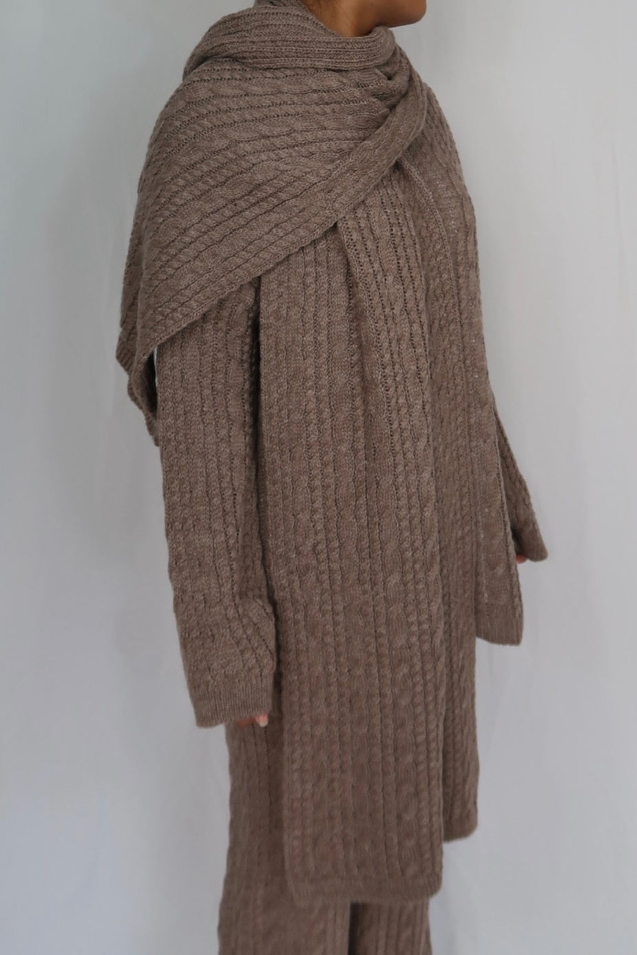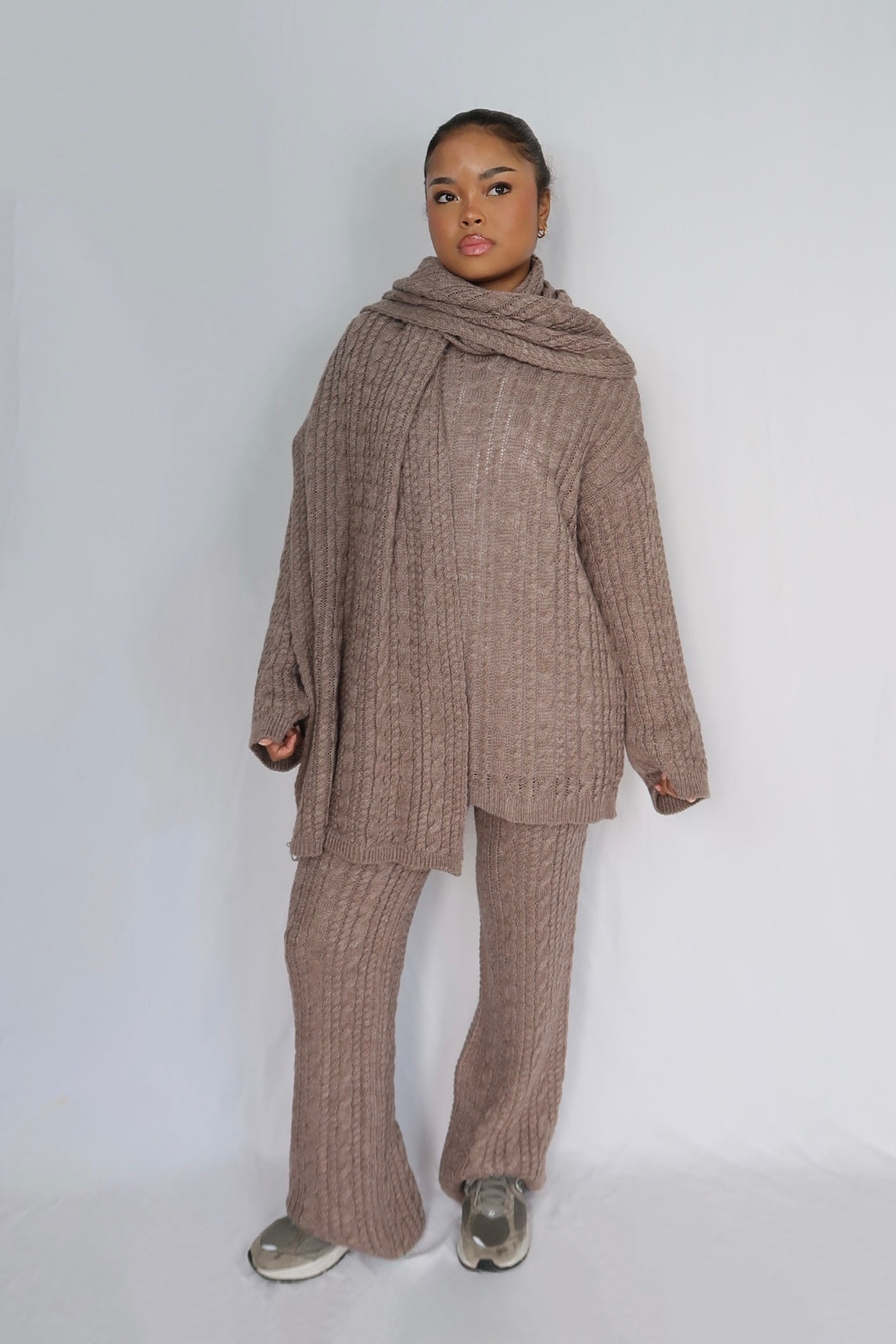 Confectionné dans une maille douce et côtelée, il offre un confort enveloppant tout en conservant une silhouette élégante. Le haut à coupe droite et manches longues se porte facilement au quotidien, tandis que le pantalon à coupe ample assure une grande liberté de mouvement. L’écharpe coordonnée complète l’ensemble pour un look harmonieux et cosy.