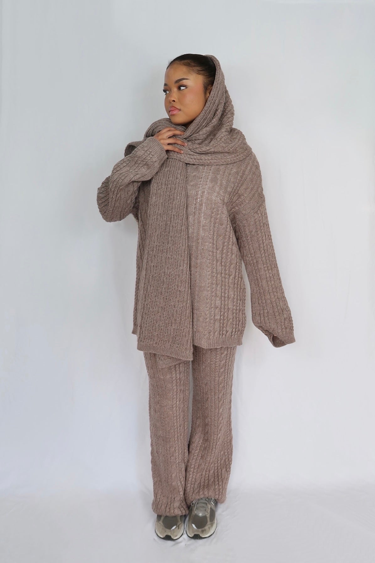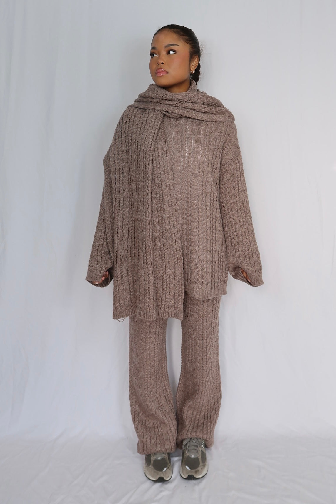 Ensemble 3 pièces en maille texturée, composé d’un haut long, d’un pantalon fluide et d’une écharpe assortie.